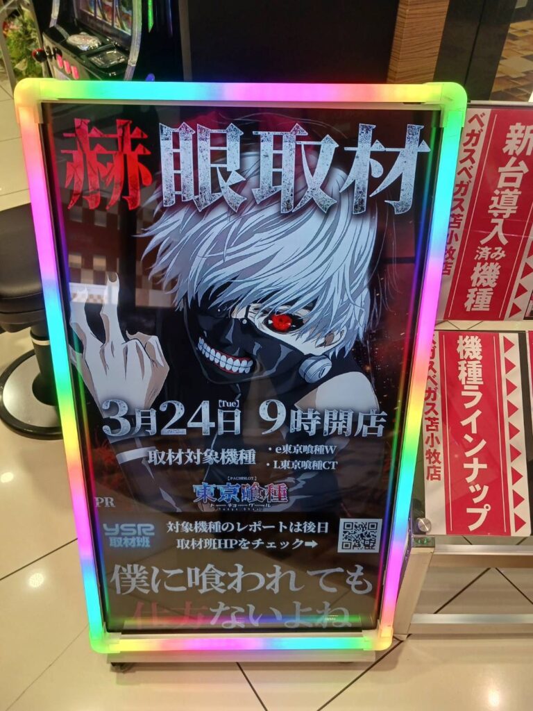3/24(火)、べガスベガス苫小牧店では「赫眼取材」が行われた。翌日の25日を前にして、人気の「東京喰種シリーズ」を対象とした仕掛けを行い、店舗を盛り上げている様子が確認できた。また、同時にBOXティッシュ販売会を開催。2日連続の販売会の開催で、常連客の喜ぶ姿も目立っていた。様々な角度からのアプローチがベガスベガス苫小牧店の人気の裏付けとなっていることは間違いないだろう。