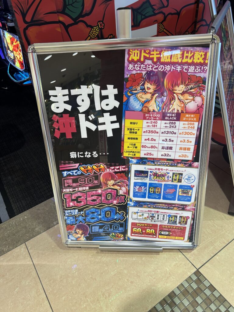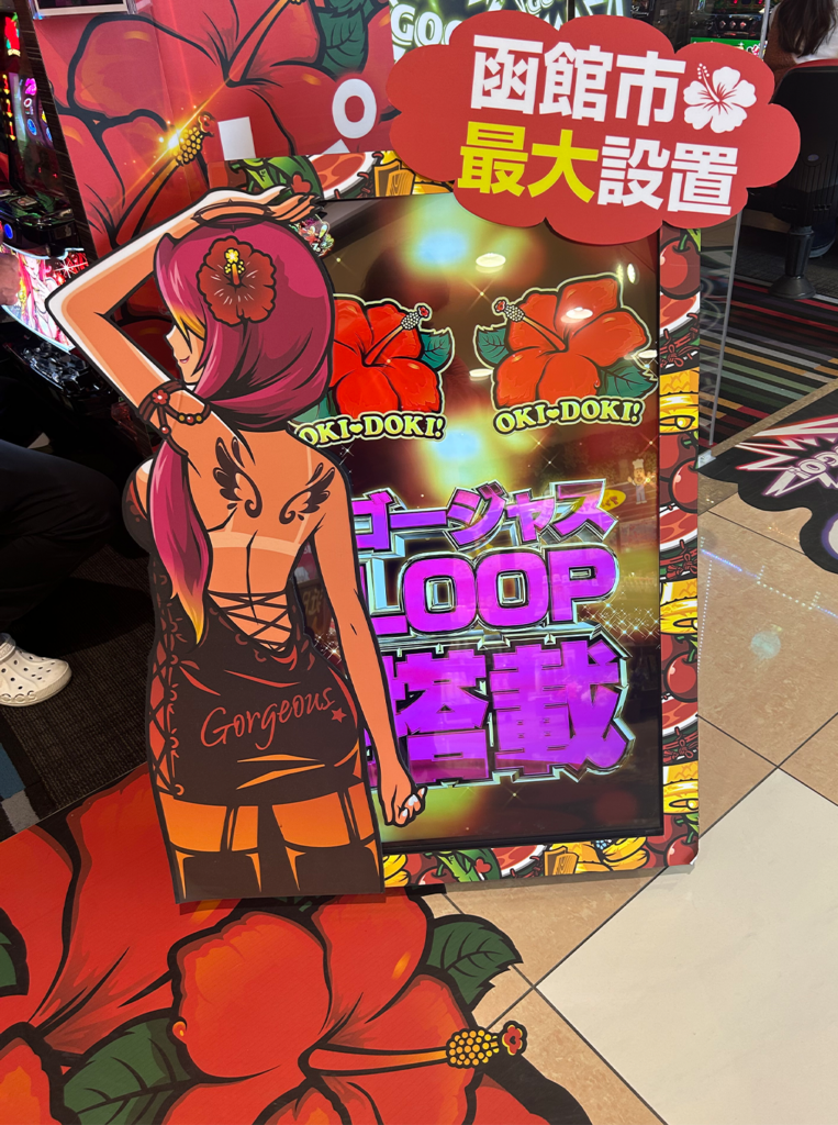 取材対象機種の「沖ドキ!ゴージャス」は合計40台の設置があり、函館市内では最大設置を誇る。沖ドキコーナーは全体的に力の入った装飾物が展開されており、まさに「ドキドキ」させるような空間が広がっていた。平日にもかかわらずたくさんのお客様の姿も目立っており、普段から大切に扱っている印象を受ける。